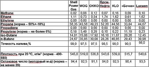 Европейский стандарт EN 589-2008 в разделе термины трактует автомобильный сжиженный газ как такой, который содержит незначительное количество непредельных углеводородов (пропилена, бутенов и пентанов (пентенов). В Украине пока действует ГОСТ 27578-87, который устанавливает допустимую норму непредельных углеводородов – не более 6%. В образце, отобранном на нелегальной АГЗС, таковых оказалось намного больше норматива – свыше 11%! Исходя их этих данных, данное топливо нельзя отнести к автомобильному. Кроме того, в газе из «бочки» также оказалось мало пропана – 33% при норме не ниже 50±10%. Для автомобиля это не принесёт существенного вреда, но расход такого газа будет намного больше.